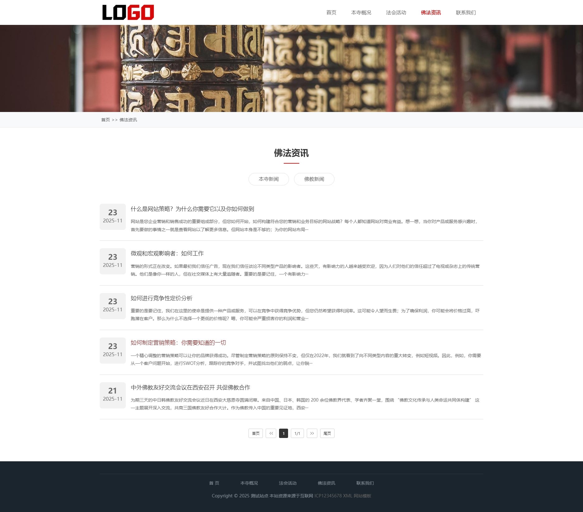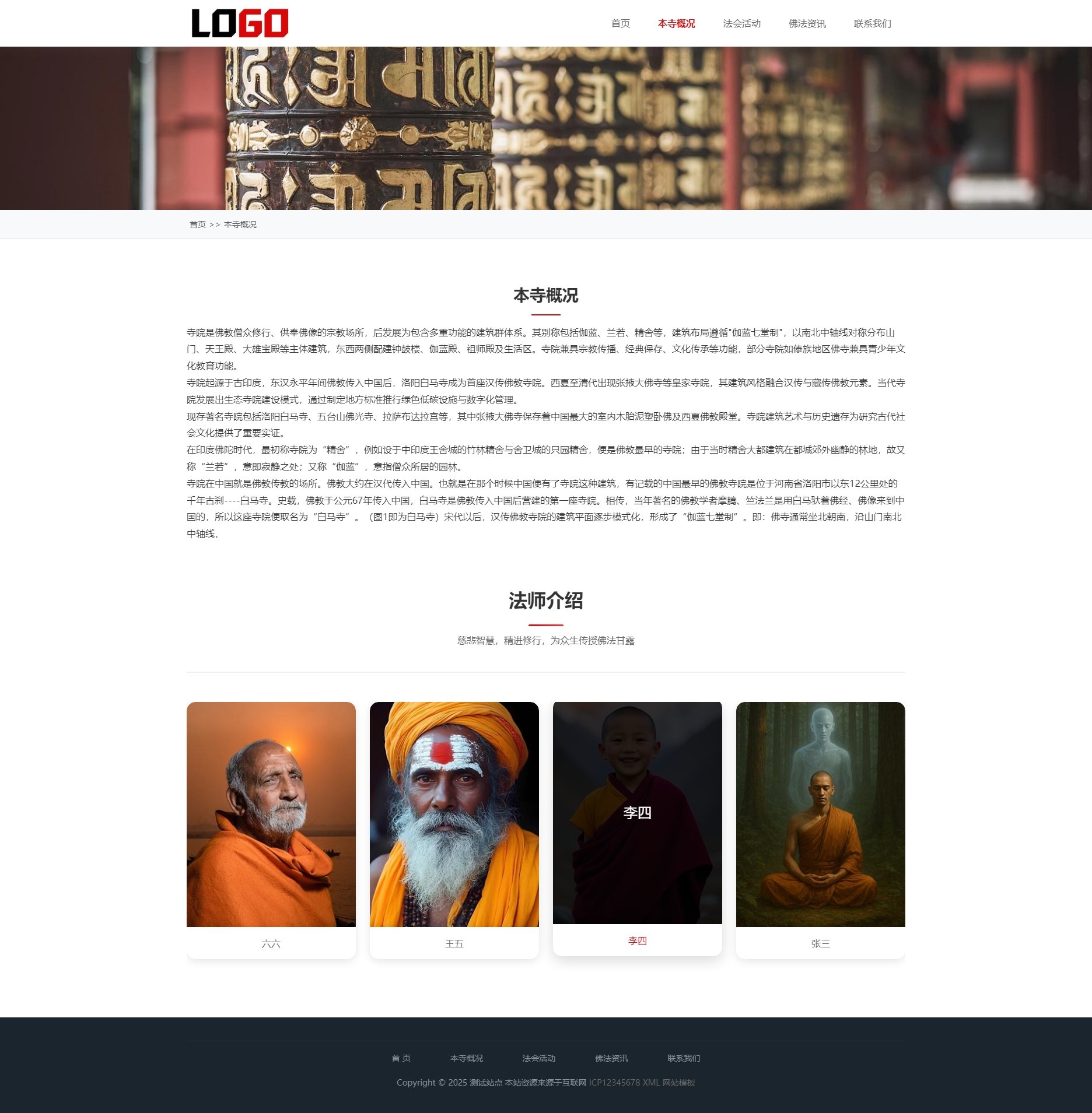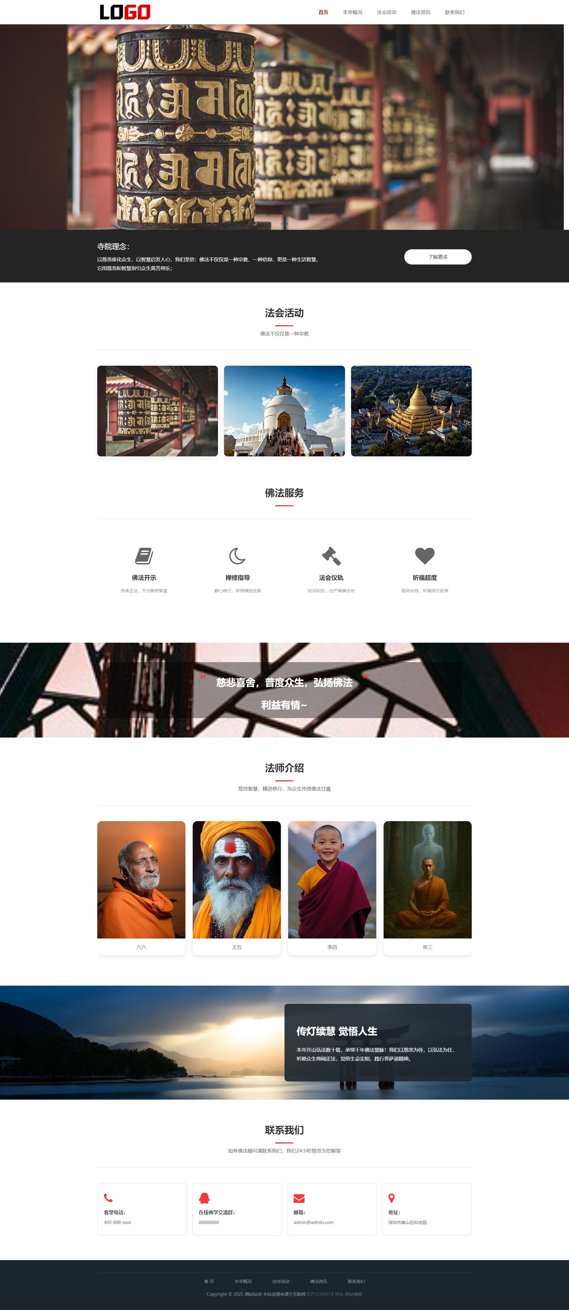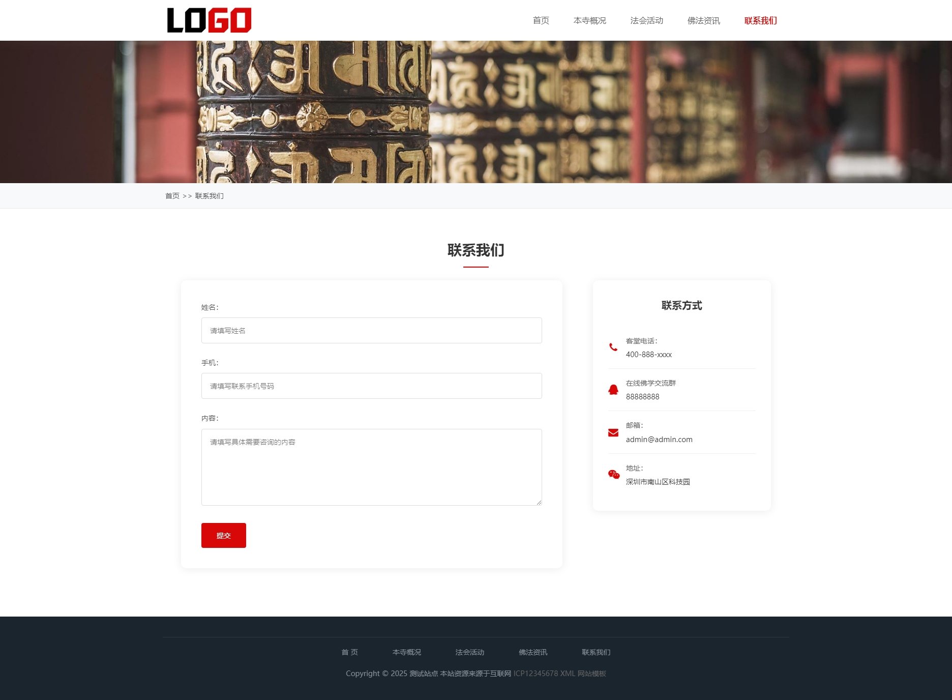 佛法寺庙佛教宣传响应式免费网站模板,大气实用,这是一款佛法寺庙佛教宣传、宗教信仰宣传展示类通用的整站网站模板。网站源码基于PbootCMS,采用响应式自适应设计,后台可一键同步数据,管理人员只需要将源代码上传到空间或者服务器上即可使用。该模板通用性设计使其可以轻松适应其他行业,只需更换相应的文字和图片即可。安装包内提供完整的安装教程和测试数据,用户可以方便地进行本地测试和部署,修改和部署上线都很方便。