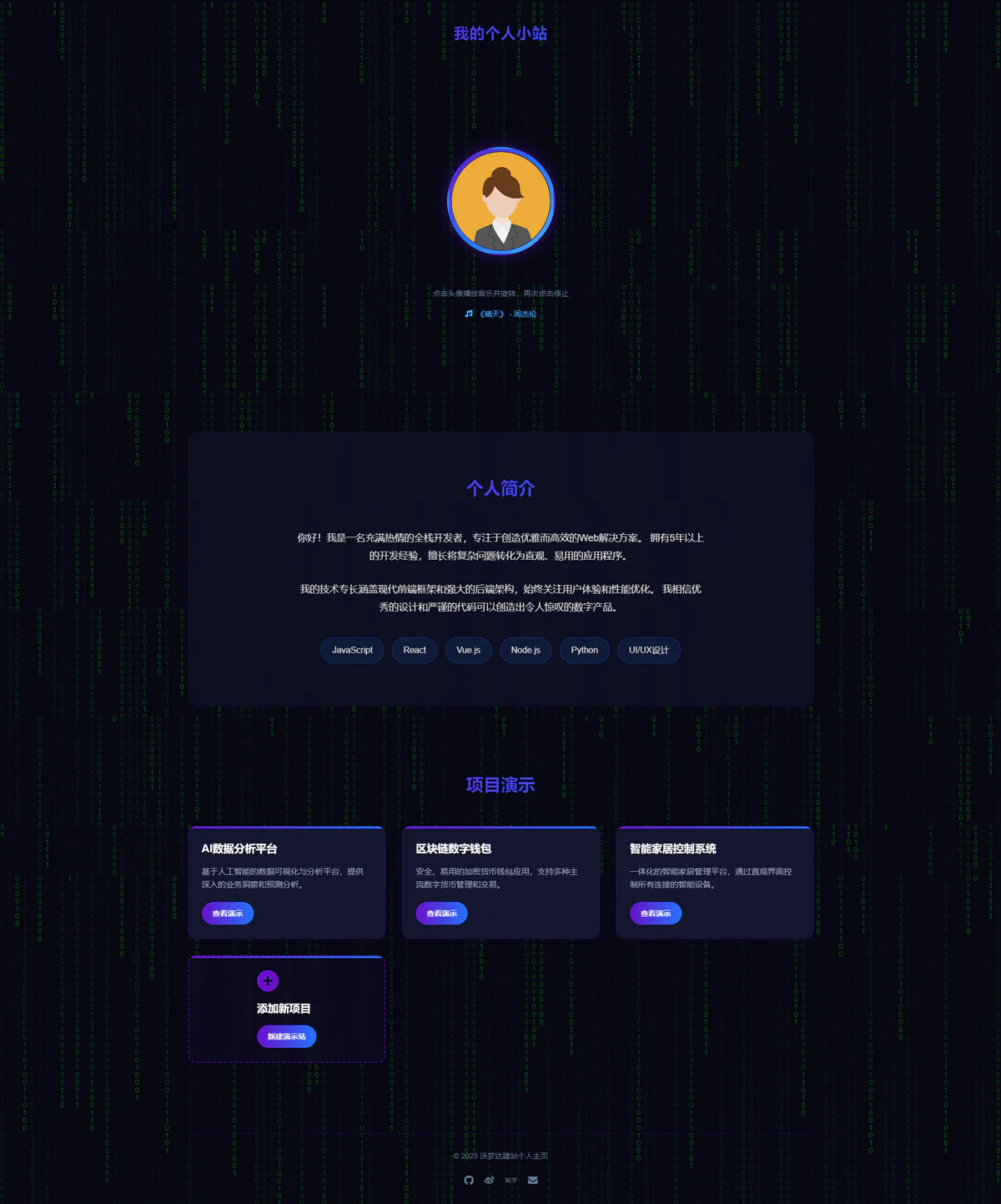 简洁个人科技主页HTML源码,一个酷炫的个人技能简介静态页模板,比较有科技感,简单实用。