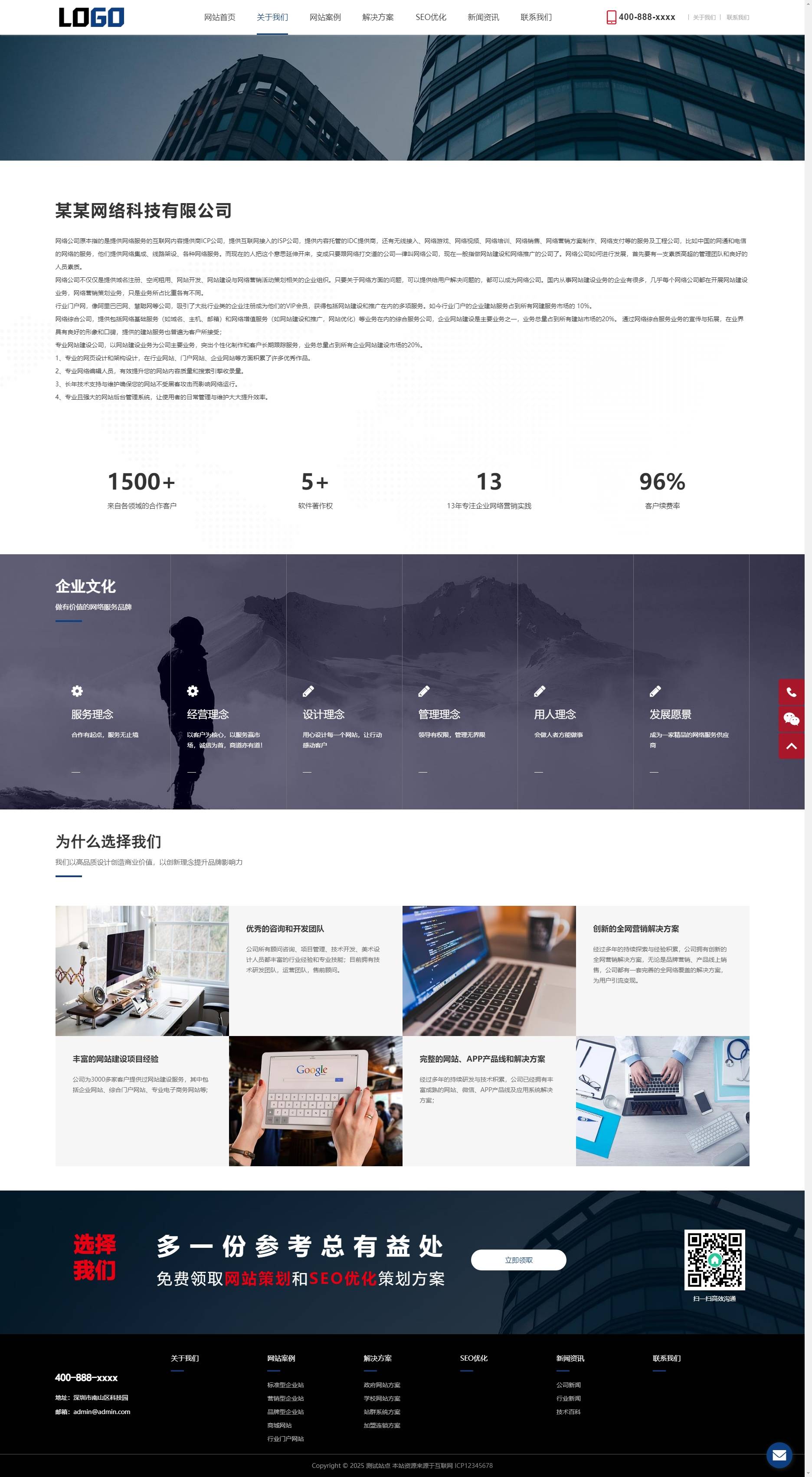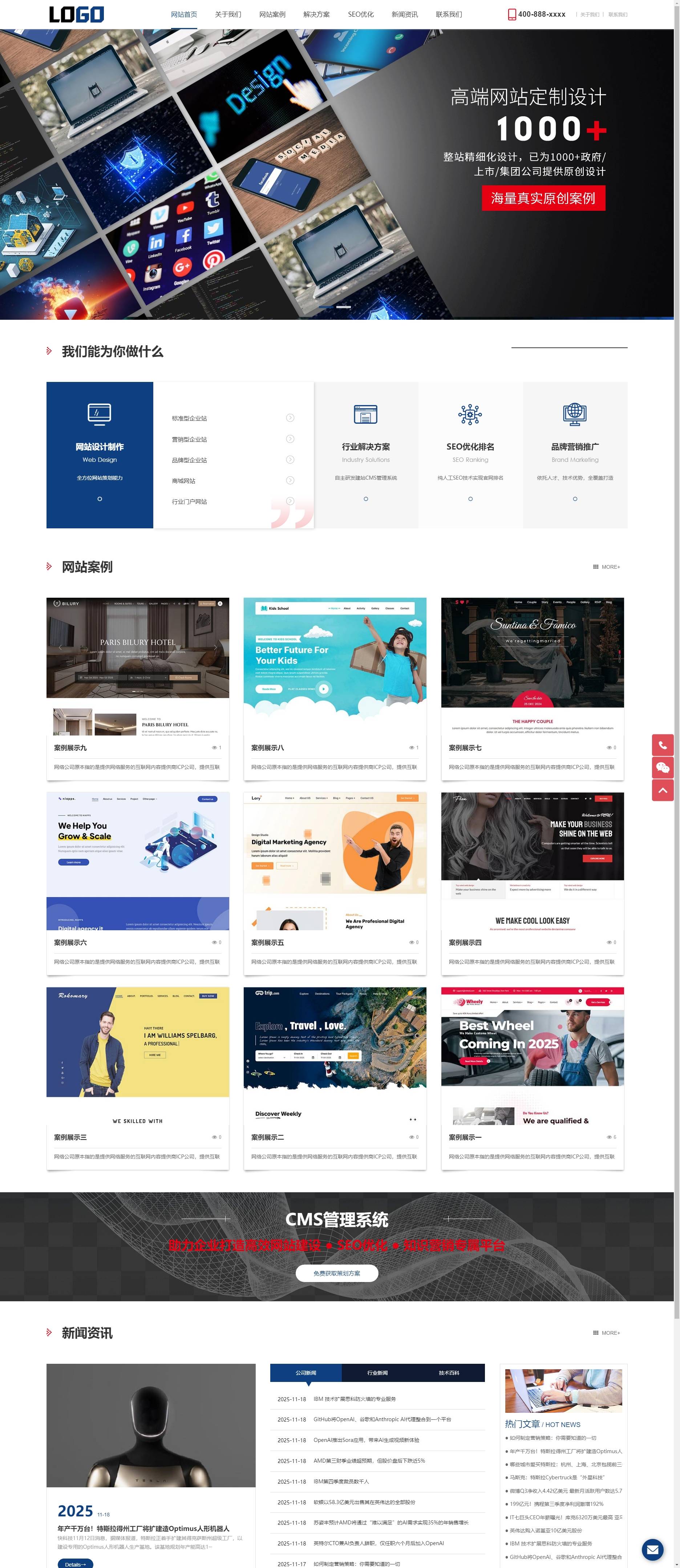 - 栏目设定:网站预设新闻资讯、案例展示、解决方案、联系我们等栏目和功能,可展示网络科技服务公司需要的内容。